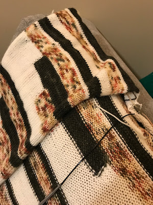 So last night, I started to join the first front piece to the back by trying to do a three-needle bind-off at the shoulder. I got to the end, looked at the stitches, and realized I'd messed it up and made it too tight. So, I picked it all out and tried again and then realized that I'd put it on the wrong side - I'd planned for it to go on the left side of the cardigan, not the right. That wasn't so much of a problem, because I realized that it worked better there... the stripes will be more visible this way... except that the bind-off still wasn't right. I took it with me to a video chat with my friend today, where she watched me say only partial sentences as I tried to graft the pieces together with a Kitchener stitch. It took me two attempts and a lot of scowling, but it finally went on properly: