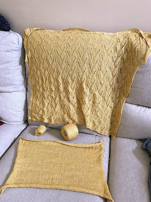 I'm currently working on millions of stitches on 2.75mm needles. I finished the back panel of this top and decided to give it a quick blocking to see what size I might end up with. It turned out kind of on the huge side, which is somewhat worrisome when I compare it with the simple stockinette front panel. It's times like these when I feel both regret and relief when I decide to knit things in pieces rather than in one piece. The gauge for both of these pieces kind of made my head spin when I was trying to figure out how many stitches to cast on, even after swatching and writing out the math over and over again. In the end, I think it'll work out ok because I think it will all even out with another wet blocking session. We'll see how that goes: